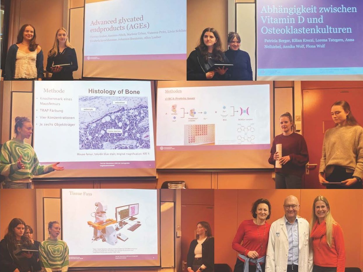 Unter der Anleitung von Sabine Flicker, Peter Pietschmann und Isabella Ellinger erforschte eine Gruppe von 14 angehenden Mediziner:innen, wie Vitamin D das Osteoklastenwachstum beinflusst und ob "advanced glycated endproducts" in vitro reproduzierbar hergestellt werden können. Ausgerüstet mit Pipetten und Mikroskopen tauchten die jungen Forscher:innen in die Laborarbeit ein, generierten Meßdaten und überprüften ihre wissenschaftlichen Hypothesen mit dem neu erworbenen Statistikwissen. Zum krönenden Abschluß präsentierten sie ihre Ergebnisse.
