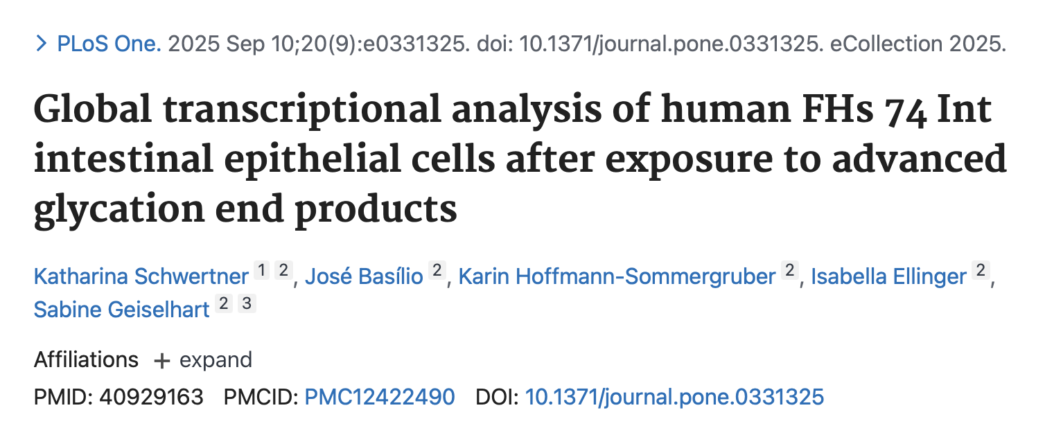 I am very happy to share the result of a colaboration with Sabine Geiselhart from Karl Landsteiner University. Our common research article "Global transcriptional analysis of human FHs 74 Int intestinal epithelial cells after exposure to advanced glycation end products" has been published in PLOS One (DOI: 10.1371/journal.pone.0331325).